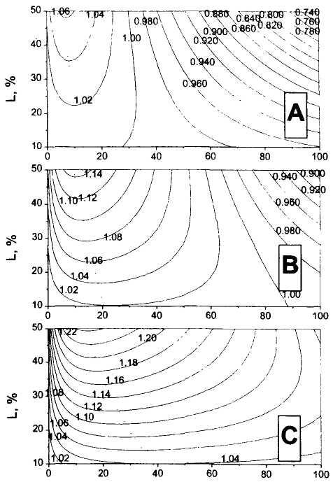 Рис. 5.1. Зависимости коэффициента роста для одного трейда от уровня стоп-заказа S и предела L, при котором акции продаются с прибылью. А – вероятность роста выбранных акций равна 0,4; В – вероятность роста выбранных акций равна 0,5; С – вероятность роста выбранных акций равна 0,6. Эти случаи описывают падающий, стабильный или растущий рынок соответственно. Данный пример также иллюстрирует выбор акций новичками (А), инвесторами с небольшим опытом (В) и профессионалами (С)