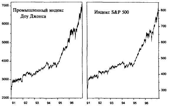 Безусловно, один индекс, характеризующий цены акций нескольких, пусть даже ведущих компаний, не является полной характеристикой рынка, и придумано много других индексов, в которых учитывается большее число компаний. Так, например, в США для описания рынка все чаще используется индекс S&P – 500 (Standart & Poor's 500 Composite Stock Price Index), включающий в себя 500 крупных компаний. Сейчас в США рост капитала инвестиционных фондов или отдельных трейдеров принято сравнивать с ростом именно этого индекса. Есть также индексы, характеризующие только небольшие компании или компании какой-либо отрасли (банки, магазины, транспорт и т.п.). Значения различных индексов публикуются во многих газетах, их легко можно найти по Интернету (эти страницы, как правило, бесплатны), и на основании анализа этих индексов можно составить полную картину состояния рынка в данный момент. На рисунке 6.1 приведены изменения промышленного индекса Доу Джонса и индекса S&P—500 за последние шесть лет.