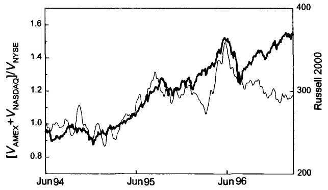 Рис. 6.4. Индекс Расселл-2000 (толстая линия) и индекс спекулятивной активности (тонкая линия). Резкий рост последнего в мае 1996 года предшествовал сильной коррекции рынка в июле 1996 года