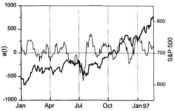 Рис. 6.5. Индекс S&P-500 (толстая линия) и эмоциональный индекс, вычисленный по данным нью-йоркской биржи NYSE (тонкая линия). Значительные отрицательные значения S&P-500 в мае-июне 1996 года предшествовали сильной коррекции рынка в июле 1996 года. Резкий августовский рост эмоционального индекса коррелирует с последовавшим в конце 1996-начале 1997 года резким подъемом рынка