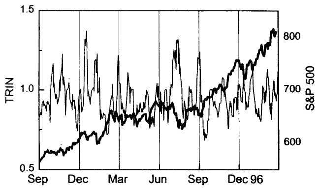 Если индекс TRIN начал сильно возрастать, что обычно связано с большими объемами продаж, то это указывает на отток денег с рынка, и вскоре следует ожидать роста рыночных индексов акции начнут расти в иене. Падение этого индекса указывает на большие объемы покупок акций, что означает усиление притока денег на рынок, и следует ожидать коррекцию, т.е. падение акций. На рисунке 6.6 приведен индекс TRIN с сентября 1996 по март 1997 года. Яркий максимум данного индекса в июле 1996 года предшествовал началу сильного роста рынка акций США.
