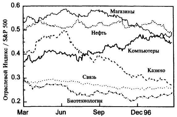 Для иллюстрации рассмотрим поведение различных отраслевых индексов во время подъема рынка акций США с марта 1996 по март 1997 года. На рисунке 6.7 показаны отношения некоторых отраслевых индексов к индексу S&P-500. Здесь можно четко проследить, как отраслевые индексы один за другим выходили в лидеры: весной 1996 года был мощный подъем акций казино и торговых предприятий, затем в эту волну включились компьютерные компании и с некоторым опозданием стал разгоняться биотехнологический индекс.