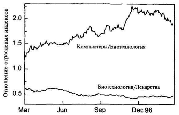 Здесь хорошо видно, что с начала 1996 года интерес к биотехнологическим компаниям уменьшился и их акции стали менее выгодными, чем акции компьютерных компаний, и такая тенденция сохранялась до декабря. Нижний график позволяет сделать вывод, что в начале 1996 года деньги частично перетекали в акции компаний, производящих лекарства. Как правило, такие компании имеют установившиеся прибыли от продажи уже испытанных лекарств и потому более надежны для инвестирования, чем более молодые развивающиеся компании, работающие в области биотехнологии. Однако в конце 1996 года интерес к рискованным биотехнологическим акциям вновь вернулся.