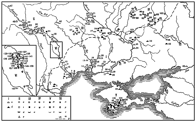 VI.п – поселения Шолданештской группы; р – поселения Сахарнянско-Солонченской группы; с – могильники Шолданештской группы; т – могильники Сахарнянско-Солонченской группы.