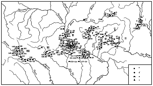 Как уже говорилось, в настоящее время в лесостепи Восточной Европы выделяется восемь локальных групп: к западу от Днепра – Правобережная Среднеднепровская (далее – Правобережная), Побужская и Западноподольская; к востоку от Днепра – Ворсклинская, Сейминская, Северодонецкая, Посульская и Среднедонская (карты 5, 8).