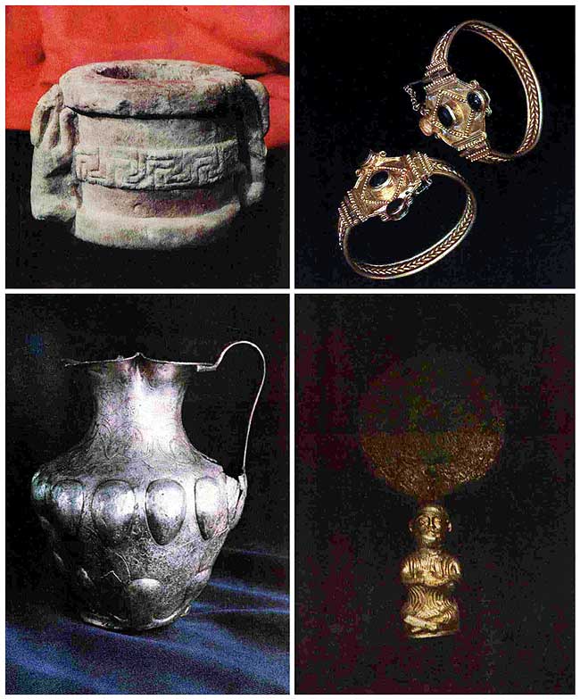 1 – алебастровая курильница; 2 – золотые браслеты со вставками; 3 – серебряный кувшин; 4 – бронзовое зеркало.
