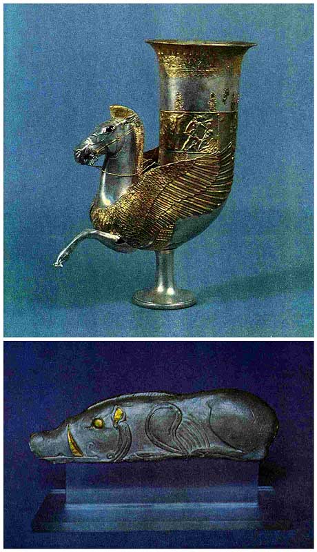 Серебряные с позолотой ритон и навершие в виде фигурки кабана из кургана у хут. Уляп (раскопки А.М. Лескова).