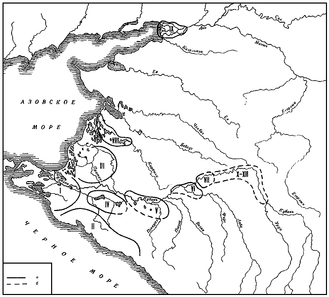 I – Таманская (синдская); II – Причерноморская (тореты-керкеты); III – Приазовская (дандарии); IV – Абинская; V – Краснодарская; VI – Усть-Лабинская; VII – Ладожская; VIII – Кирпильская; IX – Донская; X–XII – Восточные группы.