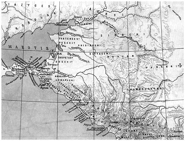 В.В. Латышев в начале века опубликовал карту Черного моря и Кавказа времен Римской империи (карта 17 – Латышев В.В., 1900–1906, вклейка). Совместив данные разных античных авторов, он расположил меотские племена следующим образом; между р. Еей и р. Челбасы предположительно помещены фатеи и псессы, что мы можем сразу отвергнуть, так как меотских памятников в этом районе нет. Южнее, в районе р. Кирпили, В.В. Латышев указал, также предположительно, терпетов и досхов. Между Кубанью и Горгиппией (Анапой) помещены аспургиане и синды, между Анапой и Новороссийском – тореты, в районе Геленджика – керкеты. Далее на побережье – ахай и за ними в горах – зихи, а уже на северном склоне Кавказа, к западу от р. Белой, – кораксы и фтейрофаги (вшееды). В районе станиц Ольгинской и Мингрельской, на левом берегу Кубани, указаны аррехи, а между ними и горами, т. е. в районе станиц Абинской, Ильской, Северской, – конапсены. К сожалению, В.В. Латышев не дал обоснования предложенной локализации.