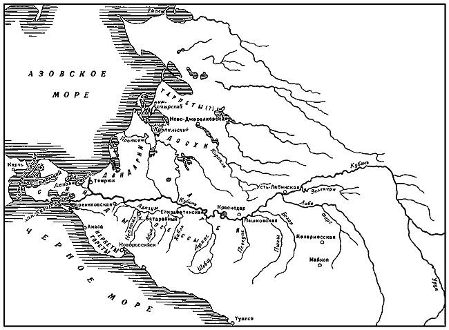Практически единственная попытка обосновать на археологических материалах карту расселения меотов была предпринята В.П. Шиловым (карта 18 – Шилов В.П., 1950). На его карте помещено племен меньше, чем описывается в тексте. Тарпеты расположены предположительно в том же месте, где у В.В. Латышева. Мы уже знаем, что на этой территории меотских памятников нет. В дельтах рек Кирпили и Протоки В.П. Шилов помещает досхов. Речь может идти о городищах на р. Кирпили. Что же касается Протоки (рукав Кубани), то на ней известно пока только одно поселение у хут. Беликова (Анфимов Н.В., 1981б), но и оно расположено выше по течению, чем указано у В.П. Шилова. Между досхами и Кубанью указаны дандарии. Они же занимают и северную часть Таманского полуострова. Синды у В.П. Шилова находятся в южной части Таманского полуострова и на юге распространяются до Анапы (Горгиппия), а на востоке – до Краснобатарейного городища. Тореты и керкеты занимают так же, как у В.В. Латышева, участок побережья между Анапой и Новороссийском. Наиболее существенно, пожалуй, то, что В.П. Шилов убрал псессов и фатеев с побережья и поместил их на Кубани – псессов по левому берегу реки вниз от синдов до р. Афипса, которая служит границей с фатеями. Отметим, что эта локализация псессов приблизительно соответствует нашей Абинской группе памятников. Фатеи же, по В.П. Шилову, занимали правый берег Кубани от дандариев до г. Усть-Лабинска с возможным заходом на левый берег в районе г. Краснодара.
