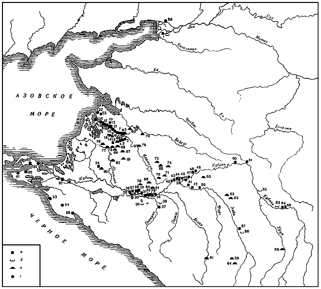 1 – Азовское (Крепостное) и его могильник; 2 – Роговское 1; 3 – Роговское 2; 4 – Роговское 3; 5 – Ново-Джерелиевское 1 и его могильник; 6 – Ново-Джерелиевское 2; 7 – Ново-Джерелиевское 3; 8 – Ново-Джерелиевское 4; 9 – Ново-Джерелиевское 5; 10 – Степное 2; 11 – Степное 3; 12 – Степное 1; 13 – Большой Редант; 14 – Могукоровское 2; 15 – Могукоровское 1; 16 – Черниевский Редант; 17 – Черный Редант; 18 – Чумяной Редант; 19 – Черепяной Редант; 20 – Ново-Покровское; 21 – Терноватый Редант; 22 – Приморско-Ахтарское 1; 23 – Приморско-Ахтарское 2; 24 – Красноармейское поселение; 25 – Елизаветинское I и его могильник; 26 – Елизаветинское II и его могильник; 27 – Краснодарский на Почтовой улице и Краснодарское в горпарке; 28 – Краснодарское КРЭС; 29 – Краснодарское на Дубинке; 30 – Пашковский 3; 31 – Пашковское 6 и его могильник; 32 – городище 2 у хут. Ленина и его могильник; 33 – городище 3 у хут. Ленина и его могильник; 34 – Старокорсунское 1; 35 – Старокорсунское 2; 36 – Шенджий; 37 – Ново-Вочепшийское; 38 – Псекупский 3; 39 – Усть-Лабинское 3 и Усть-Лабинский 2; 40 – Лесной Кордон III; 41 – селище Ново-Лабинское 1; 42 – Ново-Лабинское 2; 43 – Воронежское 1; 44 – Воронежское 3; 45 – Усть-Лабинское 1; 46 – Коллектив I; 47 – Коллектив II; 48 – Ладожское 3; 49 – Конусное; 50 – Кавказское 6; 51 – Темижбекское 1; 52 – Прочноокопский; 53 – Кургаковский; 54 – Маламино 2; 55 – Маламино 3; 56 – Большетигинский; 57 – Владимирское 6; 58 – Владимирский; 59 – Бесленеевские; 60 – Гаймановские; 61 – курганы станицы Даховской; 62 – Михайловский; 63 – Большой Петропавловский; 64 – Псебайские; 65 – Тенгинское II; 66 – курганы у станицы Пластуновской; 67 – курганы на Понуро-Калининской ОС, раскопанные экспедицией В.А. Сафонова; 68 – Греки IV и Греки V; 69 – Малаи I–III; 70 – курганы в районе станицы Брюховецкая; 71 – курганы станицы Раздольная; 72 – курган хут. Пролетарский; 73 – Греки II; 74 – курганы хут. Бураковского; 75 – курганы хут. Верхний; 76 – Лебеди I; 77 – Ново-Николаевский I; 78 – Ново-Титоровский; 79 – курган в г. Тимашевске; 80 – курганы у хут. Элитный; 81 – курганы у хут. Бойко-Понура; 82 – курганы станицы Старонижнестеблиевской; 83 – курганы у ст. Ново-Джерелиевской; 84 – курган у станицы Динской; 85 – курганы г. Кореновска; 86 – курганы у станицы Роговская; 87 – Семибратнее; 88 – Танаис; 89 – Кепы; 90 – Тирамба; 91 – Гермонасса; 92 – Фанагория; 93 – Горгишгая; 94 – Раевское городище; 95 – Баты.