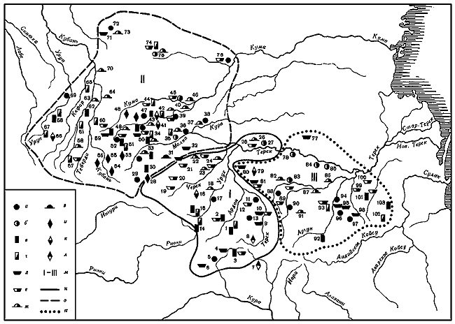 II – западный вариант: 28 – Былым; 29 – Верхний Баксан; 30 – Гижгид; 31 – Заюково; 32 – Баксан; 33 – Хабаз; 34 – Каменномостское; 35 – Этока; 36 – Зольское; 37 – станица Марьинская; 38 – поселение Зольский карьер; 39 – близ Пятигорска; 40 – Георгиевск; 41 – Ессентуки; 42 – Бештаугорский клад; 43 – Быкогорский могильник; 44 – Минеральные Воды; 45 – Обильное; 46 – Новозаведенное; 47 – Боргустанский клад и поселение; 48 – Бекешевская; 49 – Учкекен; 50 – памятники г. Кисловодска (могильники Мебельная фабрика, Белореченский 1 и 2, Сосновогорские и др.); 51 – Березовский могильник; 52 – комплекс Уллубаганалы 2; 53 – клад на р. Мушт; 54 – Хурзук; 55 – Худесс; 56 – Индышский клад; 57 – могильники бассейна р. Теберды; 58 – Карабашево; 59 – Терезе; 60 – Кызыл-кала; 61 – Тамгацик; 62 – Инжич-чукун; 63 – Дружба; 64 – Таллык; 65 – Вако-жиле; 66 – Кяфарский клад; 67 – Пантелеймоновский; 68 – Исправная; 69 – поселение Заслонка; 70 – предметы кобанского типа из кургана у хут. Алексеевский; 71 – Ставропольское погребение (раскопки Т.Н. Минаевой); 72 – Грушевское поселение и могильник; 73 – предметы кобанского типа из курганов у Ставрополя; 74 – могильник на горе Голубинка у с. Дубовая Роща; 75 – предметы кобанского типа из курганов у хут. Красное Знамя; 76 – Буденновск (Прикумск) III – восточный вариант; 77 – Алпатово; 78 – Верхний Наур; 79 – Советское (Кескем); 80 – Ахлово (Нижний Курп); 81 – Пседахе; 82 – Троицкая; 83 – Нестеровская; 84 – Шеды-юрт; 85 – Правобережное (Аду-юрт); 86 – Алды; 87 – Кулары; 88 – Алхасте; 89 – Мужита (Луговой); 90 – Бамут; 91 – Урус-Мартан; 92 – Шарой; 93 – крепость Воздвиженская; 94 – Сержень-юрт; 95 – Майртуп; 96 – Курчалой; 97 – Таузень; 98 – Ахкинчу-барзой; 99 – Новогрозненский; 100 – Исти-су; 101 – Аллерой; 102 – Курен-беной; 103 – предметы кобанского типа из могильника у с. Зандак.