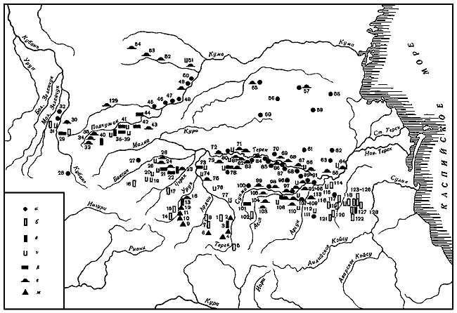 Карта 25. Памятники центральных районов Северного Кавказа сарматской эпохи (III в. до н. э. – IV в. н. э.).