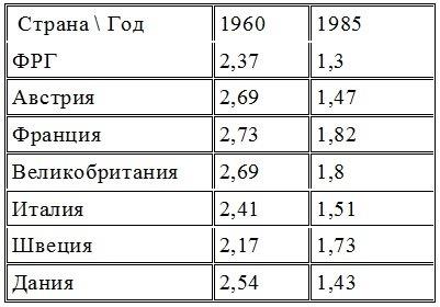 Приведем несколько цифр. Необходимое для гарантированного простого воспроизводства (то есть для того, чтобы не было убыли населения) количество детей на одну женщину– 2,2. За последние 50 лет во всех цивилизованных странах этот рубеж был перейден и теперь повсюду в “развитых” странах если и не прямое уменьшение численности населения, то его стремительное “старение” (см. таблицу).