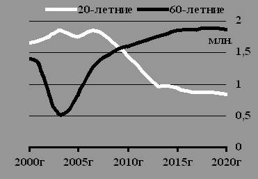 График 2. Динамика численности 20– и 60-летних русских