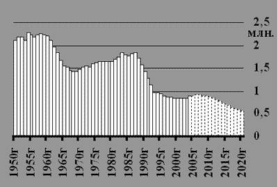 В середине 1950-х в России рождалось 2,2-2,3 млн русских детей. В 1990-х – менее 0,9 млн. Сейчас кривая числа рождений пошла слегка вверх, но с 2008-2009 гг. начнется “усыхание родников”. Пунктирная гистограмма показывает: при продолжении тенденций ХХ века “русские родники” к 2020 году “усохнут” до 0,5 млн, то есть ослабеют в 4 (ЧЕТЫРЕ!) раза по сравнению с 1950-ми годами. При этом доля русских рождений в России составит менее 50%. Так что улучшать ситуацию с русской рождаемостью надо не на проценты, а в разы!