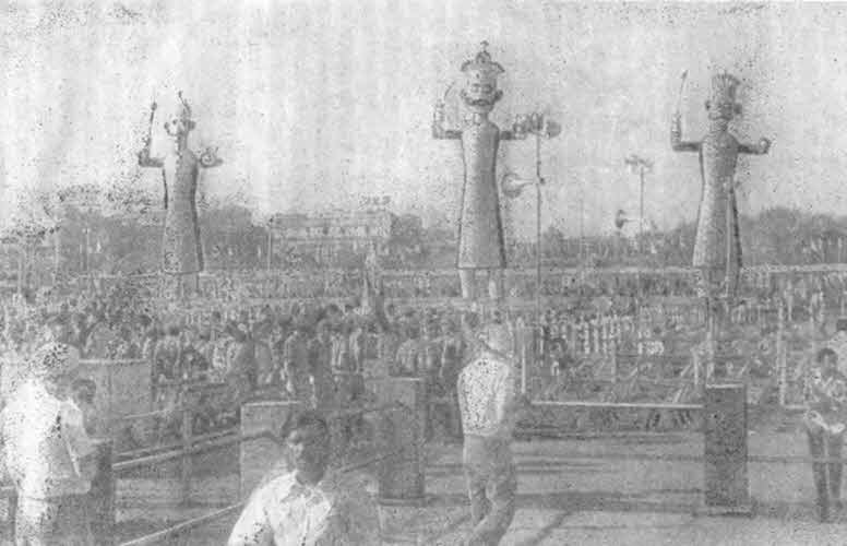 Кульминацией Рамлилы является общегородское театрализованное представление на площади у Красного форта. Представление длится от полудня до заката солнца. Улицы заполнены пестрыми толпами, медленно продвигающимися в сторону Красного форта. Массы делийцев скопились на тротуарах, на балконах и крышах домов. Медленно движутся переполненные автобусы, такси, мотоциклы, велорикши, повозки в эпицентр праздника – своеобразный театр или стадион, разбитый на секторы, огражденный высокими железными изгородями. Плотные ряды полицейских образуют коридор до самого входа. Поток зрителей вливается на площадь через множество коридоров и ворот, и каждый довольно легко находит свое место на скамейках. В течение 2–3 часов заполняется этот гигантский театр. Здесь собирается вся элита города, представители всех общественных, государственных, религиозных институтов. Медленно и важно шествуют семьи, роды, кланы, подразделения военнослужащих, школьники, брахманы и т. д. Залитая октябрьским солнцем площадь выглядит как гигантский цветной ковер, сотканный из неописуемо нарядной и разнообразной одежды зрителей, как фантастический многоцветный калейдоскоп, постоянно меняющий сочетание своих тонов и красок. И над всем этим многоцветьем возвышаются сооруженные по случаю праздника гигантские фигуры демонов: Раваны – царя Ланки, его брата – Кумбхакарны и сына Раваны – Индраджита. Время от времени глаза ракшасов ко всеобщему удовольствию начинают вращаться, рты открываются, а руки с копьями то и дело поднимаются и опускаются. Но зрители еще чего-то ждут. И вот из арочных резных ворот выезжают тройки белых коней. В колесницах сидят главные герои Рамаяны. В одной – добрые, в другой – злые. Зрители узнают Раму, Ситу, Ханумана, Лакшмана и демонов-ракшасов. Колесницы следуют друг за другом на некотором расстоянии, позволяющем врагам обстреливать друг друга из луков. Маленькие золотистые стрелки то и дело взмывают вверх, не причиняя никому вреда. Каждая серия стрел сопровождается дружными возгласами толпы. Колесницы совершают несколько кругов по площади, время от времени останавливаются, чтобы разыграть батальные сцены или представить отдельных эпических героев, – какой, дескать, он грозный и могучий, что у него за сила, за повадки и оружие. Все эти манипуляции, сопровождаемые пением и чтением текстов из «Рамаяны», продолжаются до полного захода солнца. Когда же башни Красного форта и вся площадь погружаются в синие сумерки, загораются прожекторы и их оранжевым светом высвечиваются фигуры демонов, на площади воцаряется глубокая тревожная тишина ожидания. Еще мгновение – и произойдет кульминация, апогей праздника, знаменующий победу, торжество добра и правды над силами зла. Вот колесница Рамы приближается к демонам, и Лакшман, натянув тетиву, выпускает свою разящую стрелу в туловище Индраджита, внутри которого вспыхивает огонек. Разрастаясь, он охватывает всю огромную фигуру демона. Столб огня поднимается высоко в черное ночное небо. В это время Хануман поражает стрелой фигуру демона Хумбхакарны, и она также охватывается огнем. Наступает очередь для поединка Рамы с Раваной. Рама натягивает тетиву своего легендарного лука и пускает смертоносную стрелу в самого главного носителя зла – в Равану, фигура которого загорается с оглушительным треско