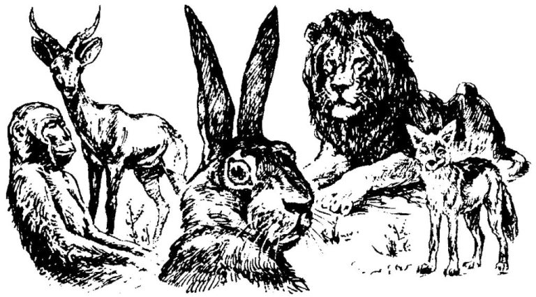 В описываемом в сказках обществе африканских животных, как и среди людей, сложилась строгая иерархия. Наверху царят гранды – львы, слоны, пантеры, леопарды, а внизу копошится простонародье – антилопы, газели, черепахи, скорпионы и, естественно, зайцы.