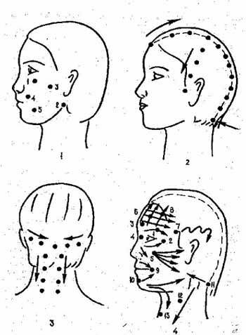 Точки 1-13 на рисунке 4 указаны лишь на одной стороне лица. Точно такие же точки имеются и на другой стороне. Поэтому работать надо одновременно обеими руками: правую сторону массировать правой, а левую – левой рукой.