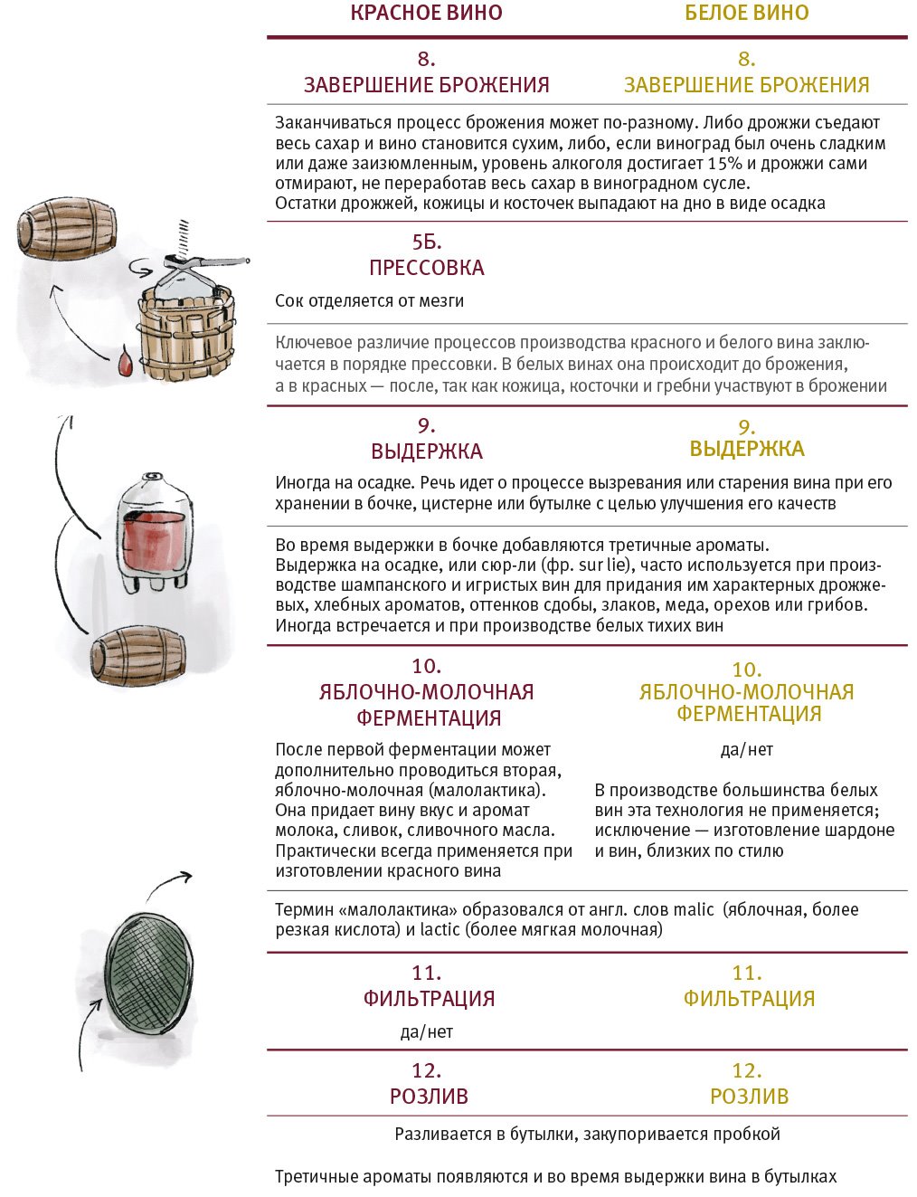 Все, о чем мы говорили выше, относится к винограду, так как в первую очередь непосредственно сама ягода дает основные вкусы и ароматы (см. ниже раздел «Классификация ароматов»). Все, что добавляется в процессе ферментации и на дальнейших этапах выдержки, в том числе выдержки в бутылке, – результат мастерства винодела. Ему приходится принимать десятки решений как до, так и в процессе производства вина. Когда собирать виноград? (Зависит от того, теплый был год или холодный, засушливый или дождливый.) Какой должна быть ягода – чуть недозревшей для сохранения свежести и кислотности или чуть перезревшей для большей насыщенности, сладости, крепости? Ферментировать в стальном чане или в дубовой бочке, короткий срок или более долгий, с выдержкой на осадке, с настаиванием сусла, с яблочно-молочной ферментацией или без них? Фильтровать вино после ферментации и настаивания или до того? И так далее.