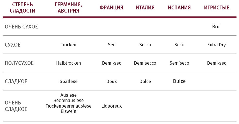 ОБОЗНАЧЕНИЯ СТЕПЕНЕЙ СЛАДОСТИ ВИН В РАЗНЫХ СТРАНАХ