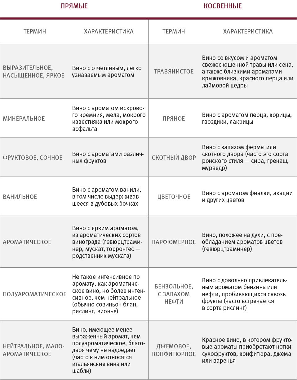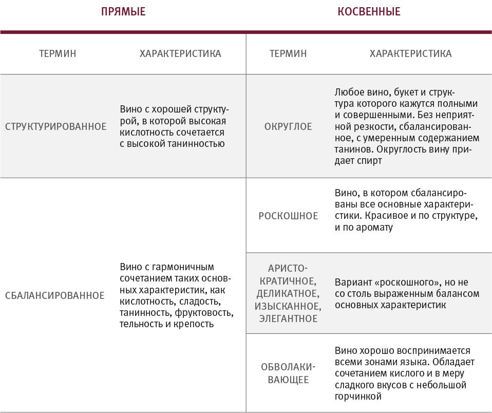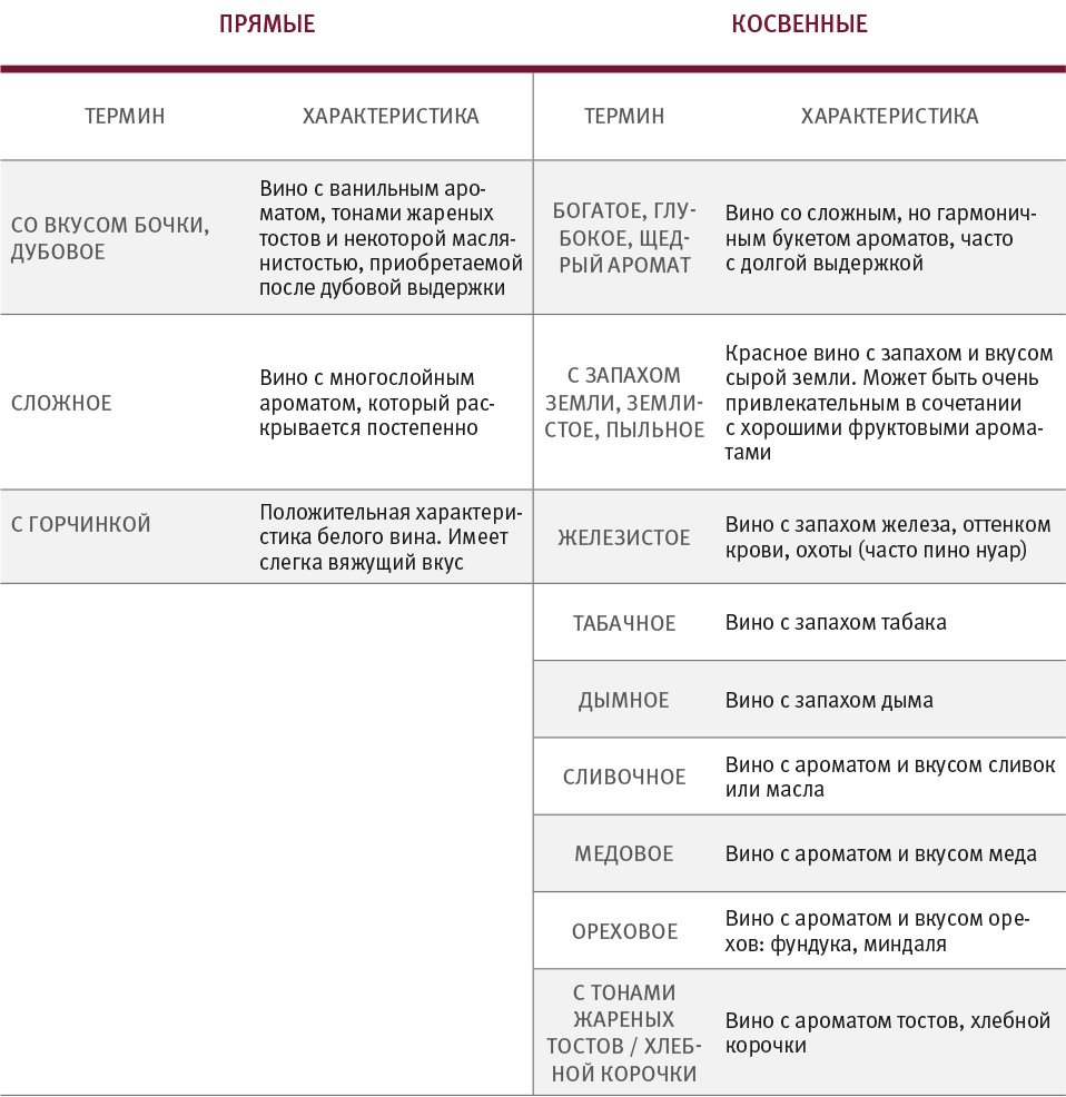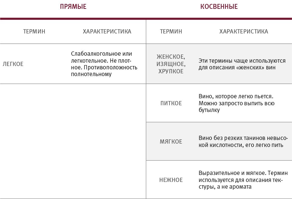 Прямые определения – более объективные, конкретные, однозначные, позволяют сравнить одно вино с другим. К косвенным относится эмоционально окрашенная лексика с использованием субъективных образов и метафор. Именно ассоциативные дескрипторы и метафоры составляют главное украшение лексикона всех любителей вина.