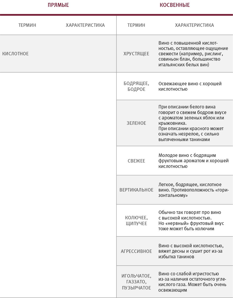 Характеристики, влияющие на вкусоароматические ощущенияКислотность. Это важнейшая характеристика вина, влияющая на его структуру (скелет) и придающая напитку бодрящий вкус. В винограде содержатся винная, яблочная, лимонная и другие кислоты. Уровень кислотности вина измеряется по шкале pH и колеблется в пределах от 2,5 (уровень pH лимона) до 4,5 pH (уровень pH йогурта).