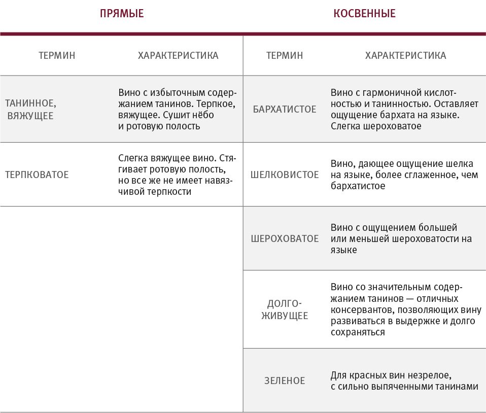 Наличие танинов – натуральных дубильных веществ (полифенолов), содержащихся в кожице ягод, косточках и гребнях винограда, а также в дубовых бочках. Это одна из характеристик текстуры вина, придающая вину структурированность и влияющая не только на вкусовые, но и на тактильные ощущения. В красных винах танинов намного больше, чем в белых. Это связано с тем, что при производстве последних кожицу удаляют. Танины влияют на терпкость напитка, которая вызывает ощущение сухости во рту, и могут быть грубыми, шероховатыми, бархатистыми, шелковистыми, мягкими.