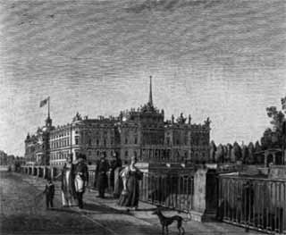 Михайловский замок в Петербурге в начале XIX в. Акварель Б. Патерсена.