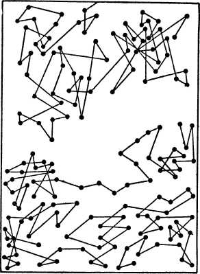 Рис. 4. Мелкие частички глины, взмученные в воде, находятся в беспрерывном движении. На рисунке показаны пути движения трех таких частичек.