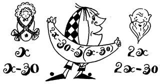 – Если возраст внука обозначить буквой «икс» (x), – сказал он, – то возраст деда будет равен двум иксам (2x): ведь при встрече с Магистром дед был в два раза старше внука. А вот тридцать лет назад внуку было (x-30) лет, а деду (2x-30) лет. Но так как тогда дед был в пять раз старше внука, то можно составить простенькое уравнение: