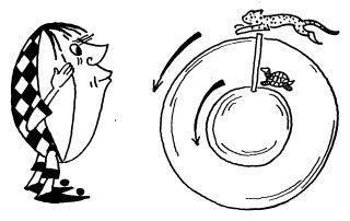 Если Единичкин гепард мчался по окружности втрое большей, чем та, по которой ползла черепаха Магистра, то за один оборот черепахи гепард успел бы сделать только треть полного оборота, если бы… если бы скорости их были одинаковы. Но ведь гепард «мчался» вдвое быстрее черепахи (видно, он и сам был из породы черепах). В таком случае он успевал за то же время сделать не одну треть, а две трети оборота. Ясно, что и гепард и черепаха снова окажутся против щели тогда, когда одновременно сделают целое число оборотов. А это произойдёт через три полных оборота черепахи. Единичка же на своём гепарде сделает при этом только два оборота. Единичка успевала через каждые два оборота крикнуть: «Привет!», в то время как Магистр по причине головокружения только и сумел, что крикнуть «Караул!».