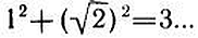 – Правильно. Но, как известно, квадрат гипотенузы равен сумме квадратов катетов, то есть 12+12=2. Значит, сама гипотенуза равна корню квадратному из двух. Отложим циркулем эту гипотенузу на одной из сторон прямого угла и снова соединим её конец с концом отрезка, принятого за единицу, того, который отложен на другой стороне угла. Получим отрезок, равный корню квадратному из трех, ведь