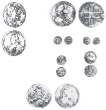 В 1701 г. появились серебряные полтины, полполтины, гривенникии десять денег.Наконец, в 1704 г. были отчеканены серебряный рубльи крупная круглая медная копейка.При этом копейка имела те же изображения, что и серебряная проволочная, а также дату, обозначенную славянскими буквами и соответствующую отчеканенным в том же году серебряным копейкам.Тогда же был отчеканен и серебряный алтын.Для чеканки рублевых монет использовали талеры, что заметно удешевляло производство.