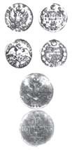 Эпизодически чеканились и меньшие номиналы золотых монет – полтина (1756, 1777–1778) и рубль (1756–1758, 1779). В 1809–1817 гг. золотые монеты не чеканились. В 1876 г. были отчеканены 25-рублевые золотые монеты, а в 1902 г. – самый крупный номинал 37,5 рубля, или 100 франков. До 1885 г. регулярно чеканился только полуимпериал, а с 1886 г. империал и полуимпериал, причем на них появились портреты императоров. В 90-х гг. XIX в. были отчеканены пробные монеты в 5, 10 и 15 русов – новый номинал, который пытались ввести в русский обиход под влиянием франка. Это явилось отражением русско-французского сближения, а также зависимости России от иностранного, в частности французского, капитала.