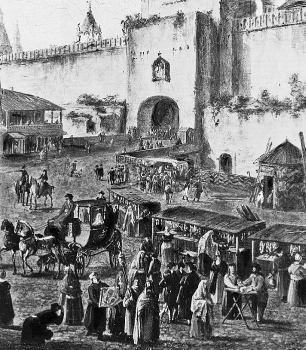 «В Китай-городе – кружала и харчевни, погреба в Гостином дворе с фряжскими винами, продаваемыми на вынос в глиняных и медных кувшинах и кружках… Здесь же, на крестцах неожиданно раздававшийся вопль и причитание о покойнике говорили о том, что родственники узнали в выставленном божедомами покойнике своего родственника… Здесь же зазывали прохожих в кружала и притоны словоохотливые веселые женщины с бирюзовыми колечками во рту („знак продажности бабенок“, – по объяснению иностранца-дипломата того времени. – В. М.). Слышен был плач детей-подкидышей, вынесенных сюда в корзинах все теми же божедомами, собирающими добровольные приношения на их пропитание… Пройдет толпа скоморохов с сопелями, гудками и домрами… Раздастся оглушительный перезвон колоколов на низкой деревянной колокольне на столбах… Склоняются головы и спины перед проносимой чтимой чудотворной иконой… Разольется захватывающая разгульная песня пропившихся до последней нитки бражников… Гремят цепи выведенных сюда для сбора подаяния колодников… Крик юродивого, песня калик перехожих… Смерть, любовь, рождение, стоны и смех, драма и комедия – все завязалось неразрывным непонятным узлом и живет вместе как проявление своеобразного уклада средневекового народного города».