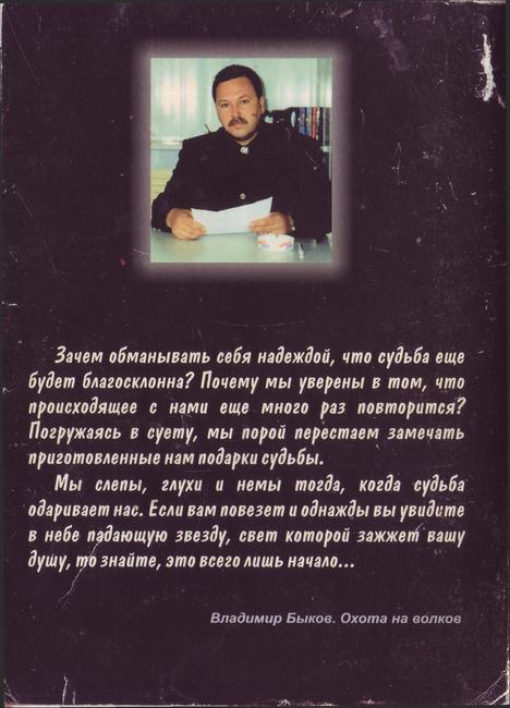 Известный предприниматель, поэт, автор-исполнитель песен вдруг взялся за перо и со знанием писательского дела создал захватывающий детектив с элементами боевика. Русский, приморский. От «крутых» поделок в стиле «экшн» повесть В. Быкова отличается ритмическим разнообразием, щедрой писательской палитрой. Да, есть и «ураганность» действия, свойственная стилю «экшн», но эта густота разрежается пейзажными зарисовками, описаниями психологических переживаний героев с включением внутреннего голоса главного из них, – Андрея, от лица которого ведется повествование. Да, есть погони, стрельба, пытки, кровь. Но все это в пределах литературной эстетики, и потому «Охота на волков» не оставляет ощущения китчевости, чернушности.