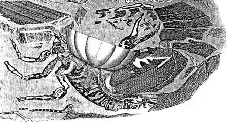 А він використав цей момент, щоб подивитися собі за спину, й ледь не зламав шию, виконуючи цю вправу. Те, що він побачив, примусило його забути танцюючу Нікту. З-під коріння дуба вистромлювалися щелепи і пурпурові надкрилки велетенського жука, який перегризав залоєне мотуззя.