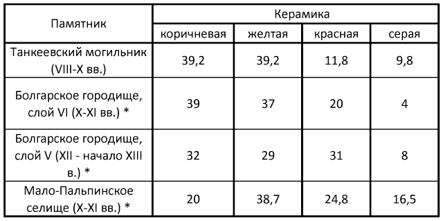 Как уже неоднократно отмечалось выше, болгарская культурная принадлежность населения, производившего захоронения на Больше-Тарханском и Кайбельском могильниках, не вызывает сомнения, так же как и прямая генетическая связь его с болгарскими племенами Приазовья. Поэтому археологическое подтверждение прихода болгарских племен из Приазовья на Волгу в конце VII–VIII вв. неоспоримо. Также очевидна и активная роль этих групп населения в формировании первого государственного объединения в Волго-Камье, в названии которого (Волжская Болгария) и одного из стольных городов (Болгары) сохранилось название болгарских племен. Чем же объяснить тогда, что культура болгарских племен не легла в основу культуры этого государства? Такое положение могло сложиться лишь при том условии, что преобладающая этнокультурная основа Волжской Болгарии была иная и, скорее всего, не болгарская, в ее больше-тарханском варианте. Действительно, как неоднократно отмечалось, наибольшая близость с культурой Волжской Болгарии домонгольского периода проявляется в материалах Танкеевского и близкого ему могильников, которые были оставлены населением, в этническом и культурном отношении отличным от болгарских племен. Численность этого населения, вероятно, значительно превосходила болгар, о чем свидетельствует простое сопоставление размера Больше-Тарханского и Танкеевского могильников. Если в первом число погребений доходило до 800–850, то во втором оно в несколько раз больше, – коло 5,5–6 тыс. К тому же количество могильников танкеевского типа больше могильников больше-тарханского типа.