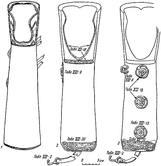 Колчаны и их части в разной степени сохранности зафиксированы в 17 погребениях. Форму колчанов восстановить трудно, так как в большинстве случаев обнаружены лишь железные и медные крючки, петли и костяные обкладки, редко медные бляхи, украшавшие плоскость и ремни колчана (табл. XIII). Колчаны, очевидно, в основном изготовлялись из дерева и кожи; изредка, как это удалось проследить в погребении 143, они покрывались берестой. Реконструкцию внешнего облика колчанов с определенной долей вероятности можно провести по материалам нескольких погребений, особенно № 75, 143 и 212.