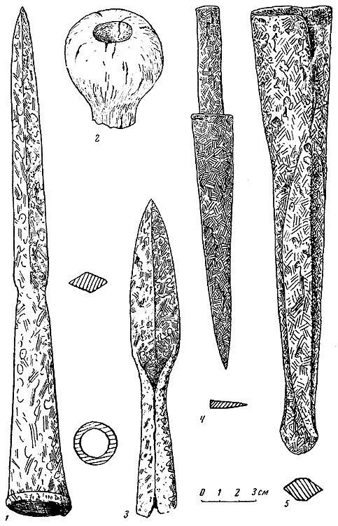 1, 3 – наконечники копий; 2 – булава; 4 – кинжал; 5 – пешня.