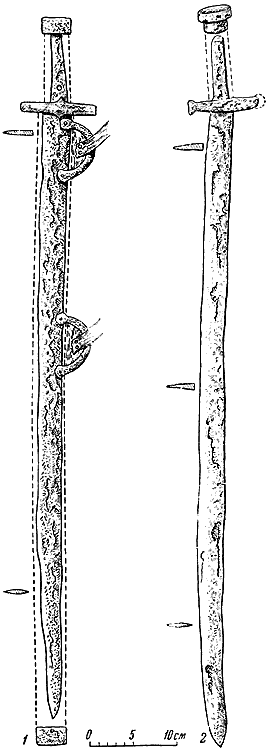 Вторая сабля (рис. 16, 1), общей длиной в 80 см, имеет клинок длиной в 70 см, слегка изогнутый, однолезвийный, за исключением конца, где лезвие на 14 см обоюдоострое. Рукоятка, отклоненная от основной оси клинка на 6–8°, состояла из железного брусчатого черешка с двумя отверстиями, в которые были продеты медные штифтики, прикреплявшие деревянные обкладки. Навершие рукояти также имело завершение в виде железной трубки с крышкой. Части деревянных обкладок рукоятки сохранились в перекрестии, склепанном из двух железных пластин длиной в 9,5 см с округлыми концами и ромбическим расширением в средней части. На сабле сохранились остатки деревянных ножен и две дуговидные скобки, расположенные под перекрестием и ниже от него на расстоянии 30 см. Скобки изготовлены из согнутых железных пластин, завершенных округлыми расплющенными концами с отверстиями для заклепок. Внутри скобок были вставлены впритык к ножнам деревянные пластинки, обтянутые кожей. В середине пластины заклепки-штифтики закрепляли ремешки портупеи.