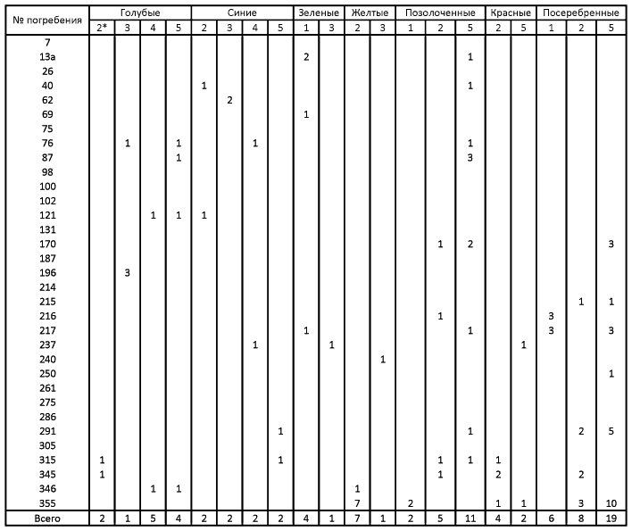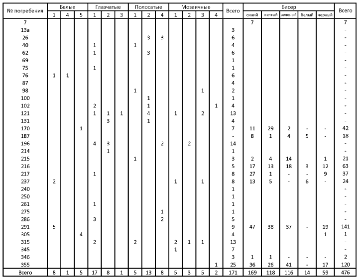 Таблица 9. Распределение бус Больше-Тарханского могильника по погребениям.