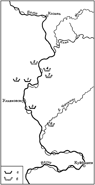 В одной из новейших работ А.П. Смирнов к числу таких памятников, кроме Больше-Тарханского могильника, относит Кайбельский могильник, вводное погребение из кургана № 8 у с. Хрящевка, Тарновское селище в Куйбышевской обл., Криушское селище и Андреевское городище в Ульяновской обл., Балымерское городище и Рождественский могильник в Татарской АССР, Тигашевское городище, Янгильдинское, Криушское селища и находки в г. Чебоксары Чувашской АССР[73]73