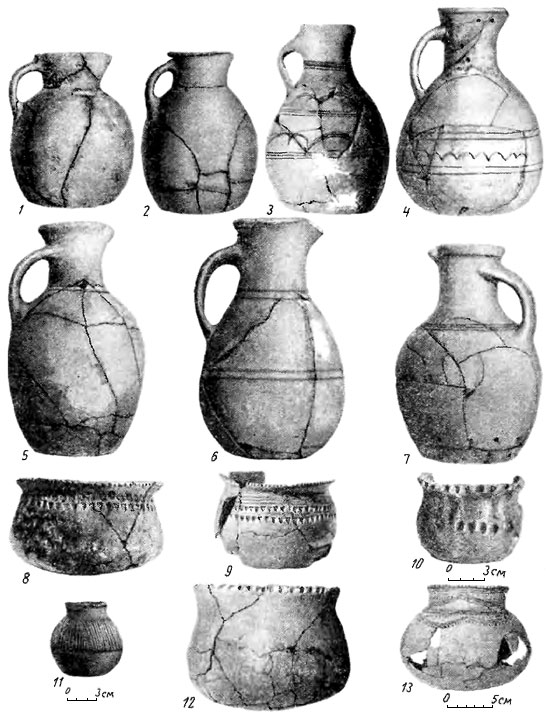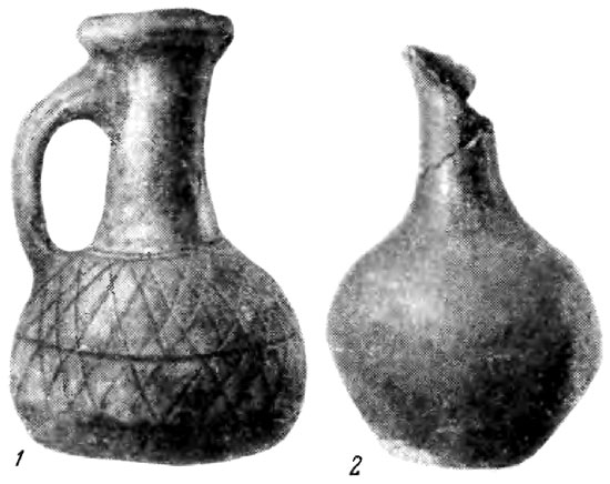 Однако и аналогичные танкеевским кувшины из Агач-калинского могильника не могли служить исходными образцами, так как они одновременны. На Северном Кавказе эти формы также появляются извне, а не возникают на местной основе. Следовательно, и на Средней Волге, и на Северном Кавказе интересующая нас гончарная керамика появилась извне и ее истоки, очевидно, следует искать в других районах.