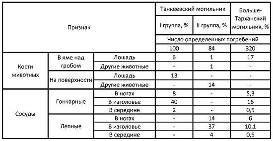 В ритуальном положении частей тел животных также наблюдается определенное различие. В Танкеевском могильнике наблюдалось четыре случая размещения над ямами целых конских туш, жертвенной пищи в виде костей животных, сосудов, помещение в изголовье лопаток животных (коровы, быка, овцы), а также частое сопровождение умерших жертвенной пищей и ритуальным положением частей лошадиной туши непосредственно в гробу, тогда как в погребениях Больше-Тарханского могильника неизвестны погребения ни с целыми тушами лошадей, ни с лопатками животных, а большая часть ритуальных частичных конских захоронений размещена над перекрытием могильной камеры.