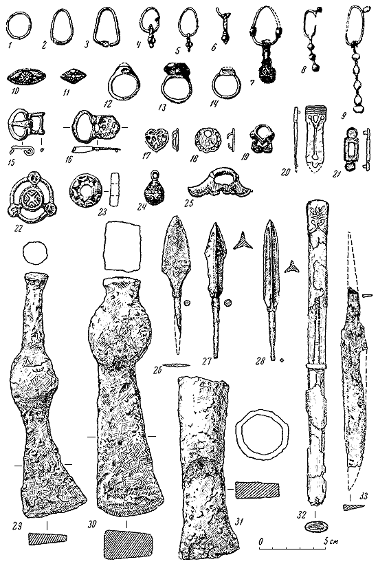 1, 2, 4, 5, 7, 8, 9, 12, 13, 19, 25 – серебро; 3, 6, 15–18, 20–24 – бронза; 10–11 – золото; 26, 33 – железо.