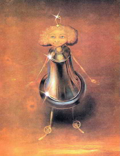 Между тем музыка играет да играет; вот всё тише да тише, как будто что-то цепляется за каждую нотку, как будто что-то отталкивает один звук от другого. Вот Миша смотрит: внизу табакерки отворяется дверца и из дверцы выбегает мальчик с золотою головкою и в стальной юбочке, останавливается на пороге и манит к себе Мишу.