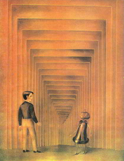 Миша учтиво поклонился; мальчик-колокольчик взял его за руку, и они пошли. Тут Миша заметил, что над ними был свод, сделанный из пёстрой тиснёной бумажки с золотыми краями. Перед ними был другой свод, только поменьше; потом третий, ещё меньше; четвёртый, ещё меньше; и так все другие своды – чем дальше, тем меньше, так что в последний, казалось, едва могла пройти головка его провожатого.