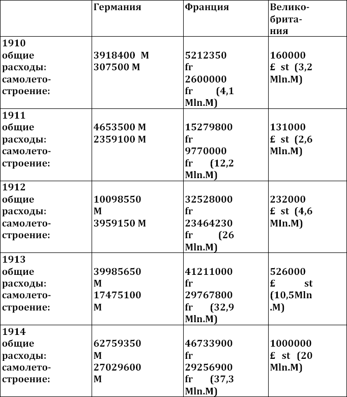 Таким образом, по оценке Жана, к маю 1912 г. в мире имелось уже около 2000 самолетов против 58 в 1910 году! Перед лицом обострившихся противоречий между Центральными державами – Германия, Австро-Венгрия, Италия – и Антантой – Франция, Россия и Великобритания – и перед лицом превентивных военных планов германского генерального штаба в 1912 г. была открыта (близкая к концертной) совместная акция промышленности и генерального штаба, направленная на то, чтобы в течение короткого срока значительно увеличить численность германских воздушных сил. В апреле 1912 г. комитет под руководством графа Артура фон Посадовского-Венера обратился к немецкой общественности и попросил пожертвовать средства на строительство аэропланов. Наряду с Ратенау, Германским банком и Хеншелем в этот комитет вошли также представитель Дисконтного общества, Северо-германский Ллойд, Хапаг и Сименс-Шукерт-Концерн. Свыше 7 млн. полновесных золотых марок положили они в основание строительства германской авиапромышленности, которая таким образом в 1912 г. пережила свой «Год основания». Германский генеральный штаб, который требовал в нескольких меморандумах значительного развития воздушных войск, заботился и о будущем сбыте. С 1912 г. германская самолетная промышленность выполнила заказ армии на 90 %. В результате директор завода «Альбатросов» Отто Винер констатировал, что военное управление «из терпеливого покупателя превратилось во властного заказчика». Значительные суммы, которые теперь в Европе отпускались на воздушное вооружение, можно представить по следующей таблице: